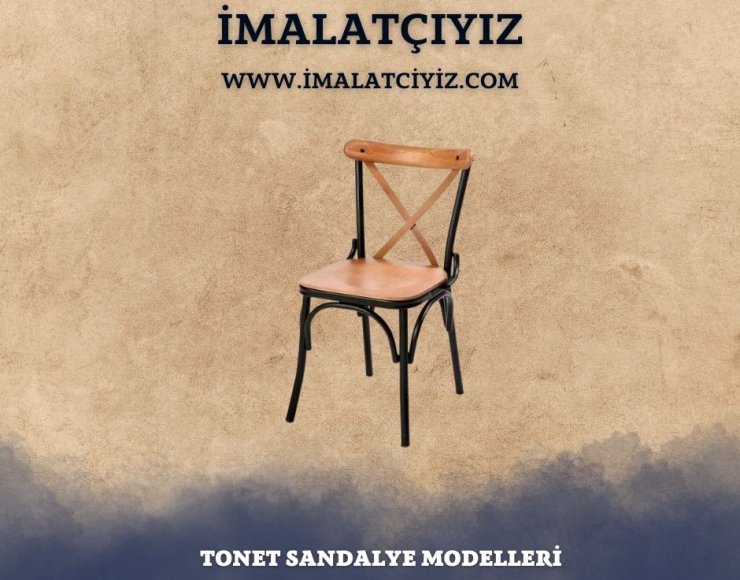 Bükme metal veya ahşap gövde, çapraz destekli ayaklar, ergonomik sırt yapısı ve dayanıklı bağlantı elemanlarına sahip tonet sandalye modelleri.