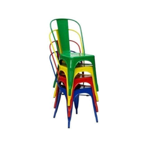 Canlı renk metal sandalye, enerjik ve modern tasarım.
