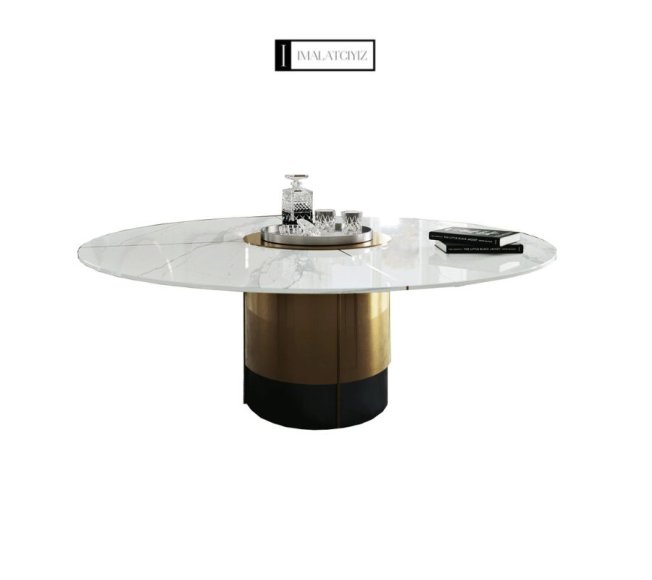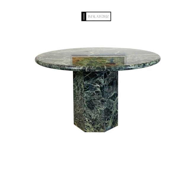 Yuvarlak mermer masa, kompakt alanlar için estetik ve pratik kullanım sağlar; temizliği kolaydır.
