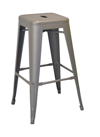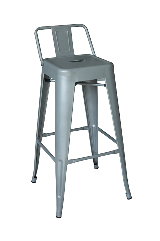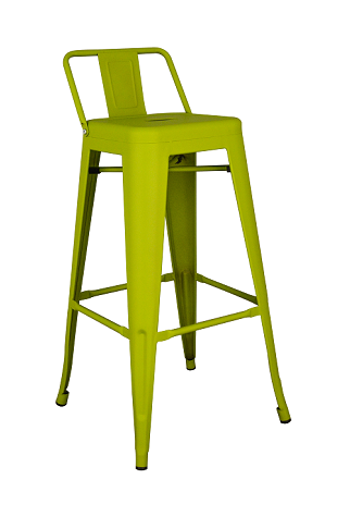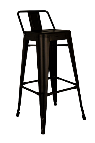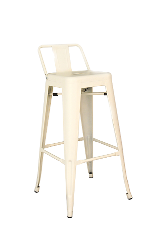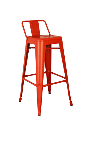Sırtlı metal bar tabure, 75 cm yüksekliğinde, dayanıklı metal gövde, endüstriyel şık tasarım, çeşitli renk seçenekleri.