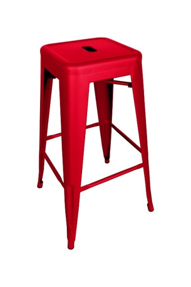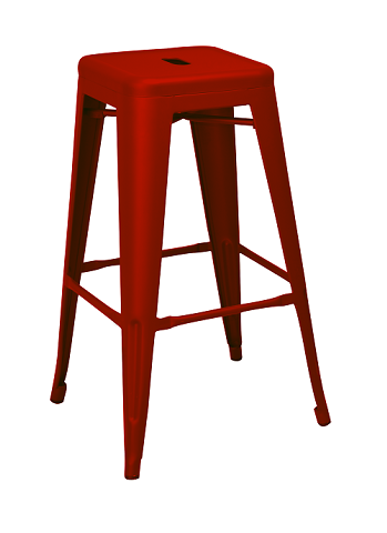 Kırmızı Tolix tabure, 75 cm yüksekliğinde, metal gövde, dayanıklı, endüstriyel şık tasarım.