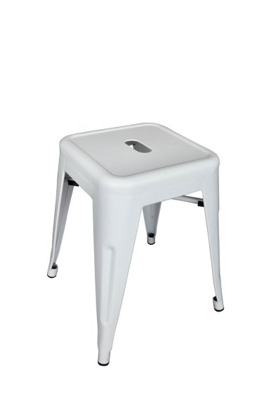 Kısa beyaz Tolix tabure, 45 cm oturum yüksekliğinde, metal gövde, dayanıklı ve şık endüstriyel tasarım.