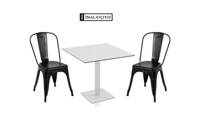 Beyaz 12mm compact masa ve Tolix sandalye; şık, dayanıklı ve modern tasarımıyla kafe, ev veya ofis kullanımına uygun pratik bir set.