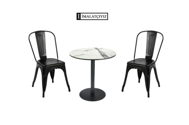 Yuvarlak masa ve Tolix sandalye; modern tasarım, sağlamlık ve kompakt kullanım sunarak kafe, ev veya balkonlar için ideal bir kombin oluşturur.