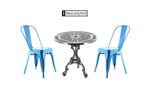 Alüminyum ayaklı masa ve Tolix sandalye; hafif, dayanıklı ve modern tasarımıyla kafe, balkon ve ev kullanımına ideal bir kombin.